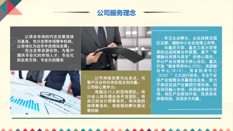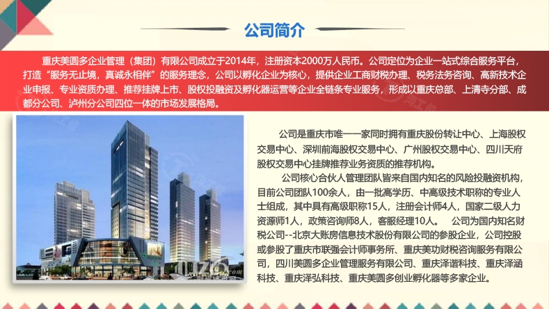 重庆美圆多定位为企业一站式综合服务平台,打造“服务无止境,真诚永相伴”的服务理念,公司以孵化企业为核心,提供企业工商财税办理、税务法务咨询、高新技术企业申报、专业资质办理、推荐挂牌上市、股权投融资及孵化器运营等企业全链条专业服务,形成以重庆总部、上清寺分部、成都分公司、泸州分公司四位一体的市场发展格局。以孵化企业为核心,提供股权投融资、推荐挂牌、上市、高企申报、税务筹划、两化融合、贯标、专精特新及财务顾问等专业咨询服务。公司还将帮助企业制定发展战略,提供优化商业模式,全程协助企业转板升级及上市融资要求。