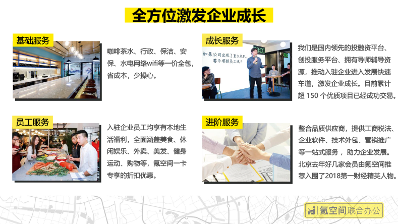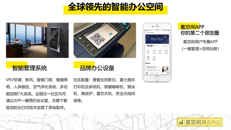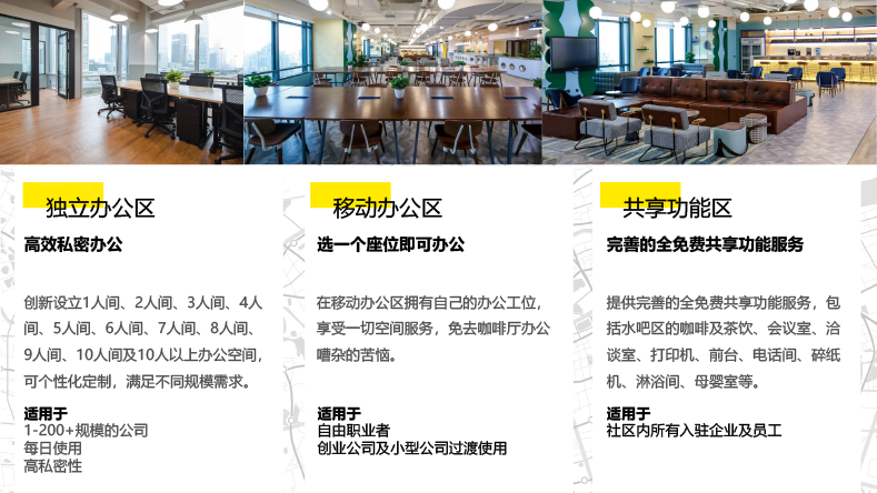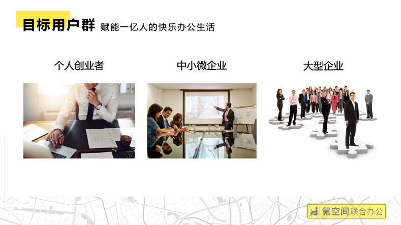 氪空间是以联合办公为载体,社群为纽带的企业服务平台。氪空间从36氪诞生之初就是解决小微团队办公难的问题,使命是“让办公更美好”,以空间产品构建线上线下社群,在提供联合办公空间的基础上,从用户需求出发推出更多围绕办公生态的服务,实现“赋能一亿人的快乐办公生活”的愿景,让联合办公成为城市商业的标配。