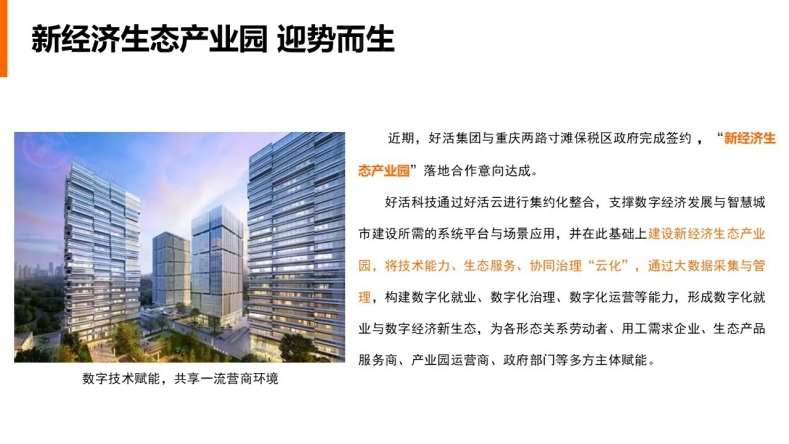 好活科技通过好活云进行集约化整合,支撑数字经济发展与智慧城市建设所需的系统平台与场景应用,并在此基础上建设好活(重庆)生态产业园,将技术能力、生态服务、协同治理“云化”,通过大数据采集与管理,构建数字化就业、数字化治理、数字化运营等能力,形成数字化就业与数字经济新生态,为各形态关系劳动者、用工需求企业、生态产品服务商、产业园运营商、政府部门等多方主体赋能。